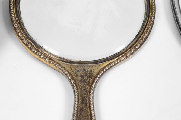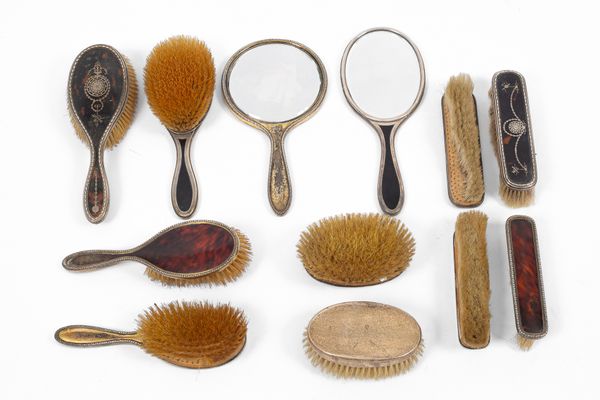 An Edwardian silver and tortoiseshell dressing set, William Comyns, London 1904, with inlaid decoration, comprising hairbrushes, clothes brushes and hand mirror and another set, Synyer & Beddoes, Birmingham 1925