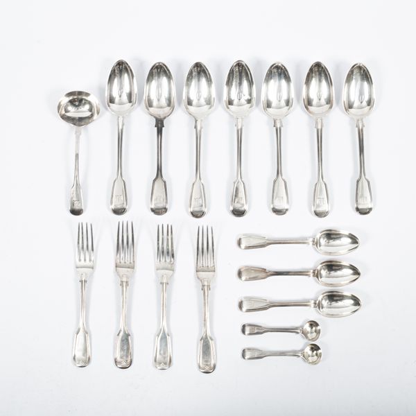 A Victorian silver part dinner service, various dates and makers, comprising: seven tablespoons, three dessert spoons, two salt spoons, sauce ladle, four table forks, bears crest of the Lucas, Ventris and Sword families, approximately 1244g
