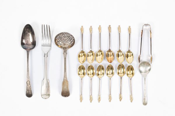 A set of twelve Victorian silver and silver-gilt apostle top teaspoons and the matching tongs, William Gibson & John Lawrence Langman, London 1883/1884, a George III bright cut spoon, Richard Jenkins, Exeter 1792, an Irish sugar sifter etc., approximately 341g