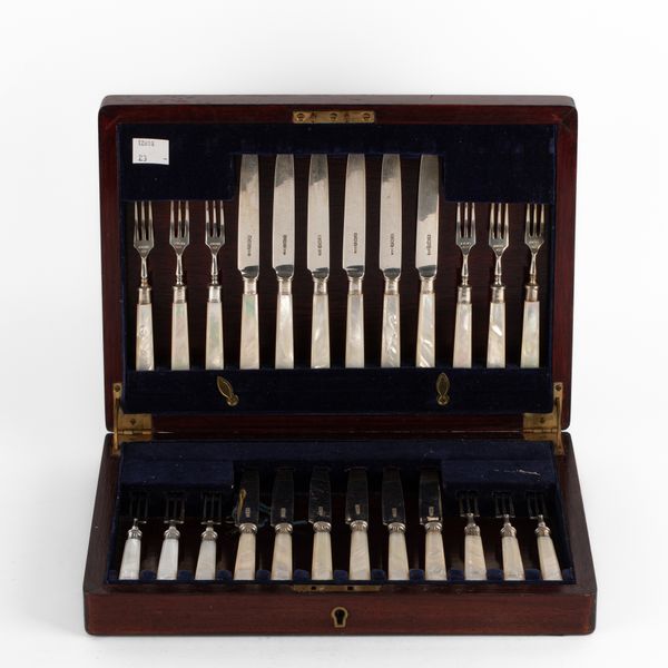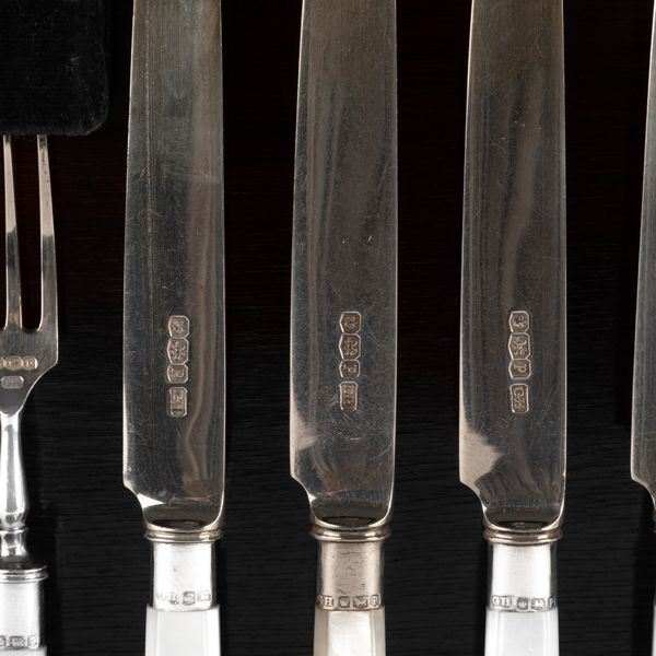 Twelve pairs of silver dessert knives and forks, George Howson, Sheffield 1932, with mother-of-pearl handles, in wooden canteen