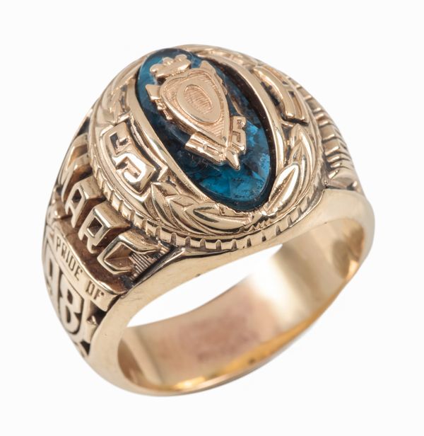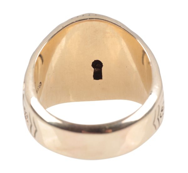 the side inscribed "War Horse", "Marc Pride Of 98", the shank stamped 10K and makers mark, ring size T, c. 18.4 grams