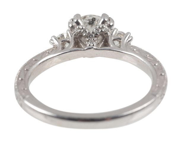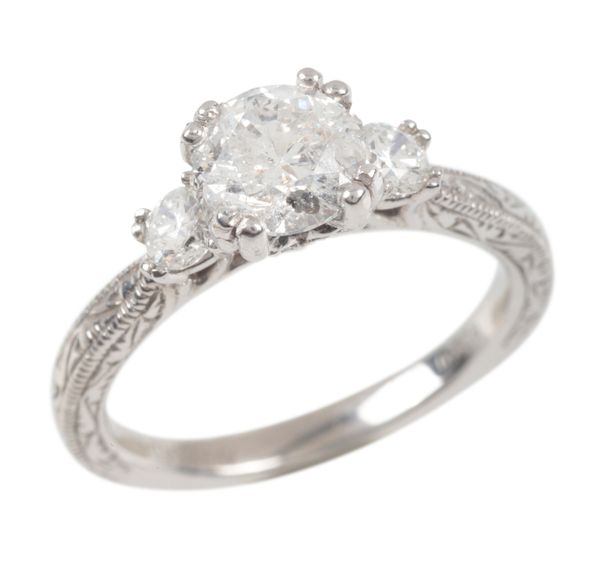 The central diamond c. 1.40 carats, flanked by c. 0.30 carats combined, with engraved shank stamped PD950 ArtCarved, ring size M ½ , c. 3.5 grams