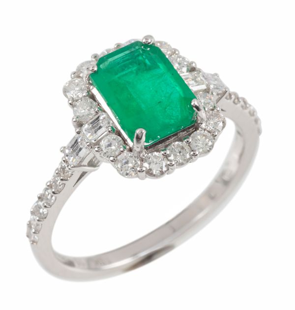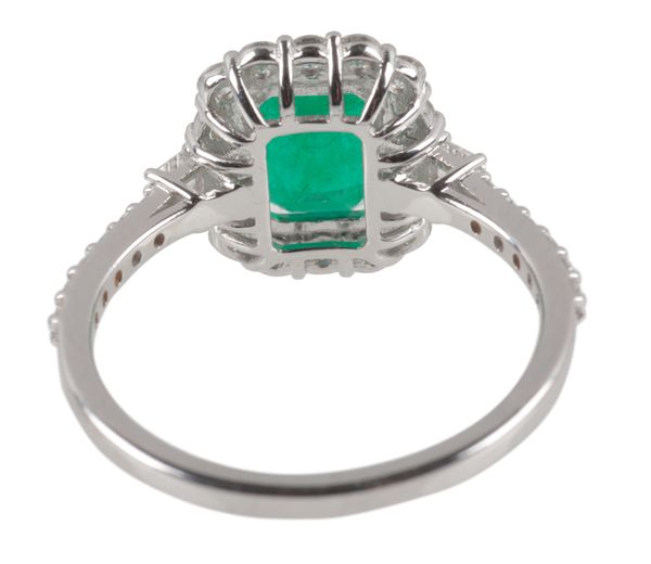 the step cut emerald c. 1.40 carats, with round brilliant and baguette diamond surround, c. 0.71 carats combined, in hallmarked 18ct white gold, ring size N 1/2, c. 3.00 grams