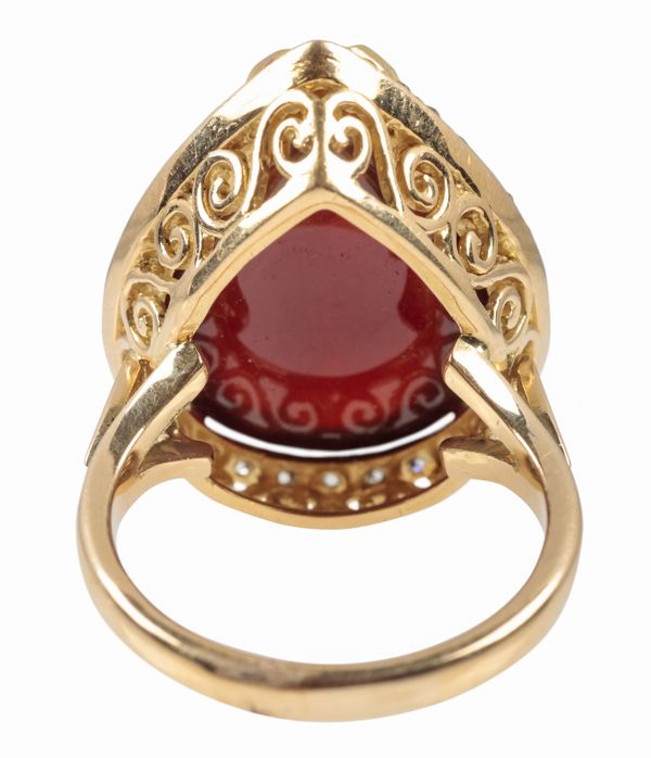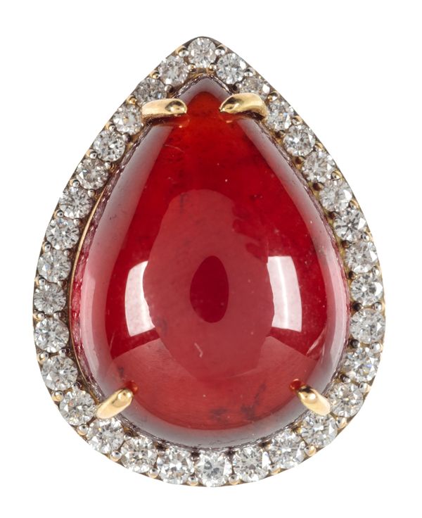 the pear shaped cabochon garnet c. 21mm x 15.5 mm, surrounded by round brilliant cut diamonds, the shank stamped 18ct, ring size O, c. 14 grams