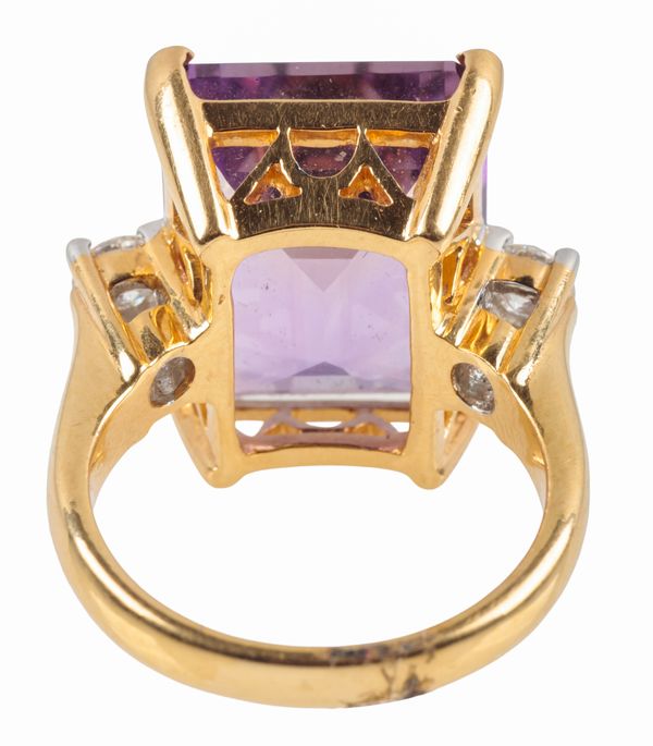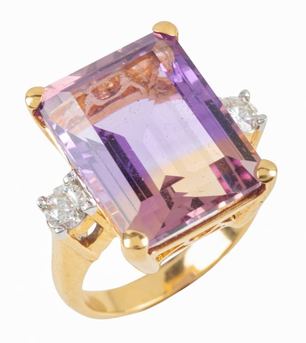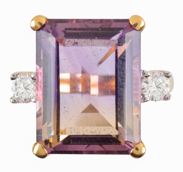 the emerald cut ametrine c. 16mm x 12mm, flanked by two round brilliant cut diamonds, combined diamond weight c. 0.40 carats, set in 18ct, the shank stamped 750, ring size N, c. 11.9 grams gross weight
