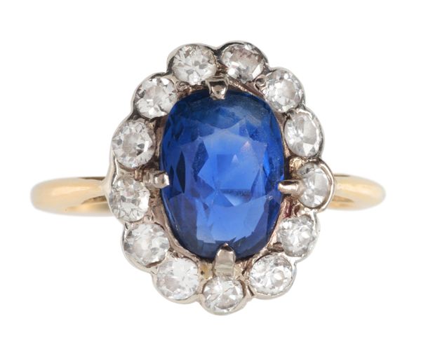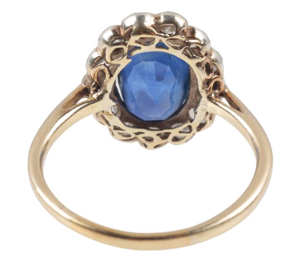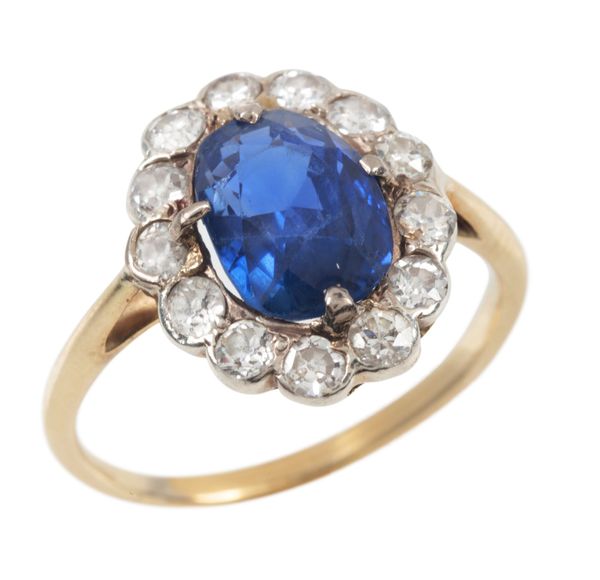 in silver on 18ct gold, set with an oval sapphire c. 3.70 carats surrounded by a cluster of old cut diamonds totalling c. 0.70 carats, no assay marks, size P 1/2, c.3.7 grams gross, verbal assessment from GCS stating sapphire is of Burmese origin with no indications of treatment