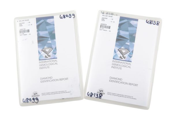 with IGI certificates stating 0.50 carats VS1, colour I and O.52 carats VS1, colour I, dated February and March 2016, each four claw mounted with screw backs, testing as platinum