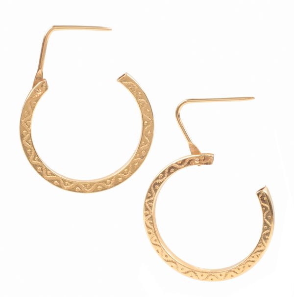 of square section decorated with a scroll and dot outer bands, with hinged fittings, unmarked, c. 28mm drop, c. 3.5 grams