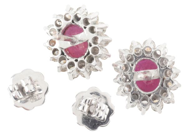 the oval mixed cut rubies c. 7.9mm x 6.18cmm, each surrounded by fourteen round brilliant cut diamonds, total diamond weight c. 0.84 carats, overall c. 14mm x 11mm, the scroll back butterfly stamped 750, the setting surface testing as 18ct, c. 5.5 grams gross weight