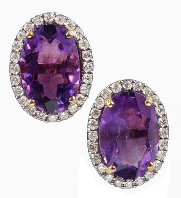 A PAIR OF AMETHYST AND DIAMOND EARRINGS