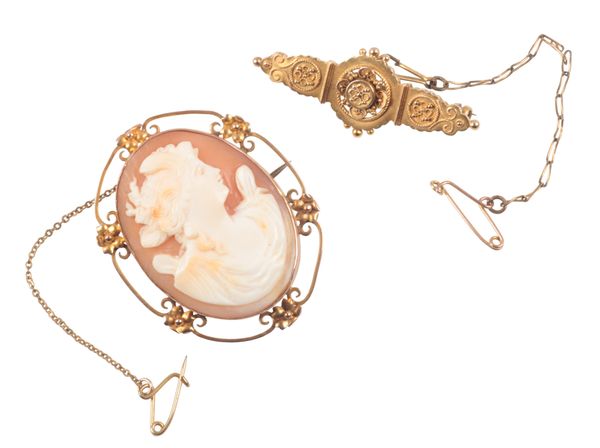 hallmarked 15ct gold, with a steel pin and removeable safety chain; together with a shell cameo brooch carved with a classical lady's bust with mount stamped 9ct, with steel pin and additional safety chain, c.14.1 grams gross weight (2)