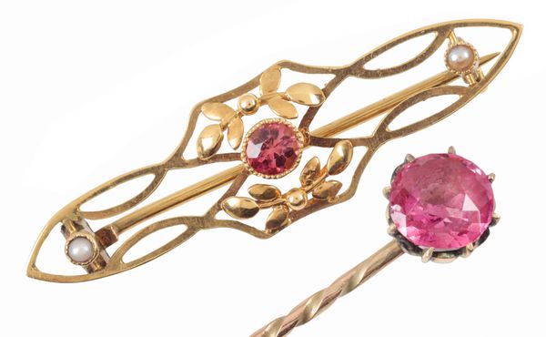 set with seed pearls and a round mixed cut paste, stamped 9ct; together with a tie pin set with a synthetic corundum, unmarked, surface testing as 9ct (2)