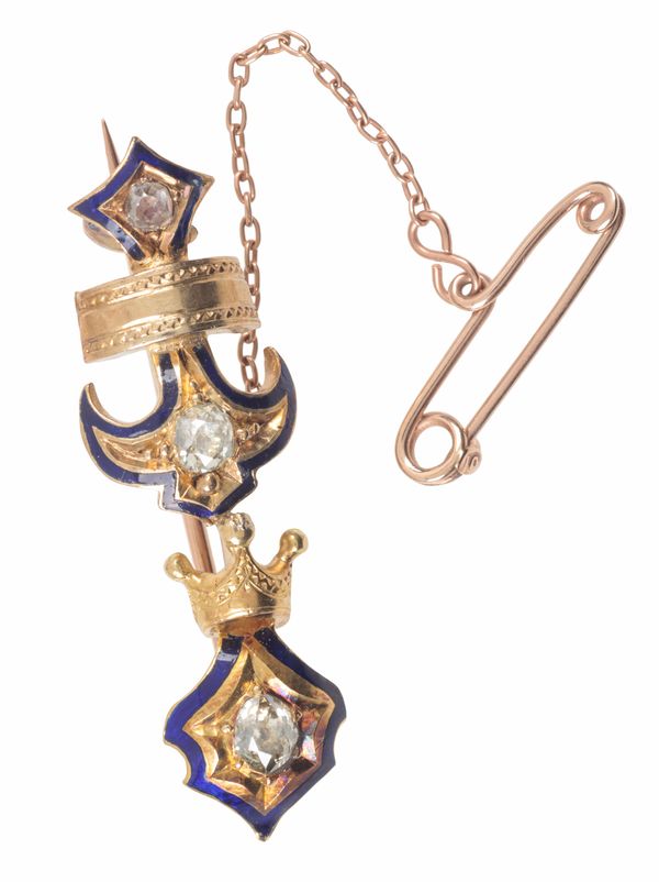 with three old cut diamonds within blue enamel bands, c. 38mm long, with detachable safety chain, unmarked surface testing as 14ct with the pin testing as 9ct, c. 6.5 grams gross weight, in fitted box