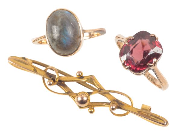 stamped 9ct; together with two 9ct rings, one set with a rectangular mixed cut zircon with shank stamped 9ct, ring size N, the other set with a labradorite cabochon with shank stamped 9ct, ring size M, c. 7.4 grams gross (3)