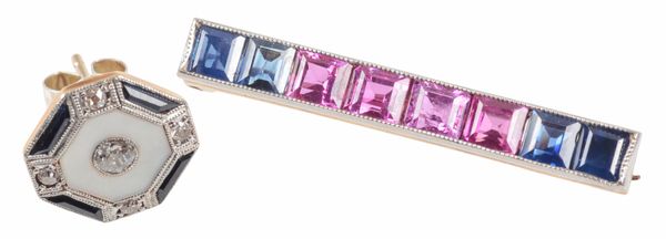 the brooch set with four calibre cut pink sapphires flanked by two calibre cut blue sapphires, c. 30mm long, unmarked, surface testing as 14 carats, c. 2.6 grams, in fitted box; together with a single stud earring set with mother of pearl, diamonds and sapphires, stamped 18ct Platinum, converted from a dress stud with post and butterfly marked Silver, c. 1.4 grams