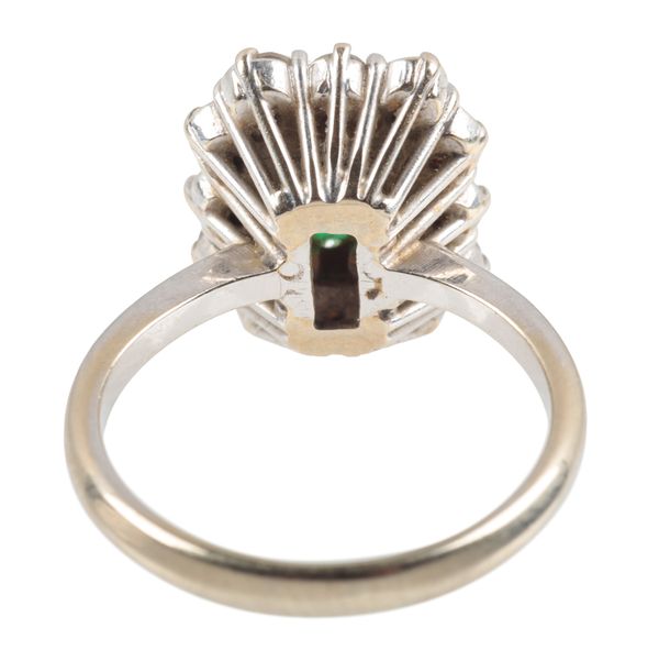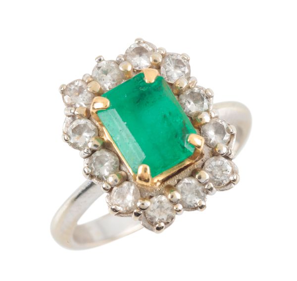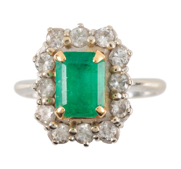 the octagonal step-cut emerald, c. 0.80 carats, surrounded by a border of twelve brilliant-cut diamonds, totalling c. 0.50 carats, to an 18ct gold shank, ring size L, c. 6.0 grams