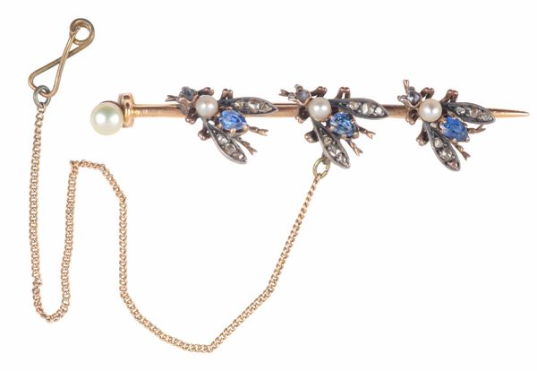 each with a pear cut sapphire thorax, seed pearl body, rose cut diamond set wings and head, c. 52mm long, with additional safety chain, unmarked, surface testing as 14ct, c. 5.1 grams