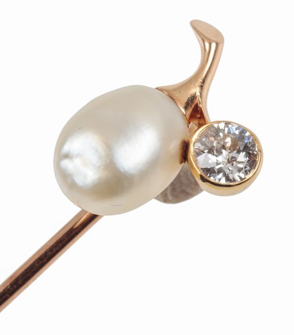the baroque shaped pearl (untested) mounted as a hanging fruit with collet set round transitional cut diamond, unmarked, surface testing as 14ct and the pin 9ct, c. 3 grams, in fitted case