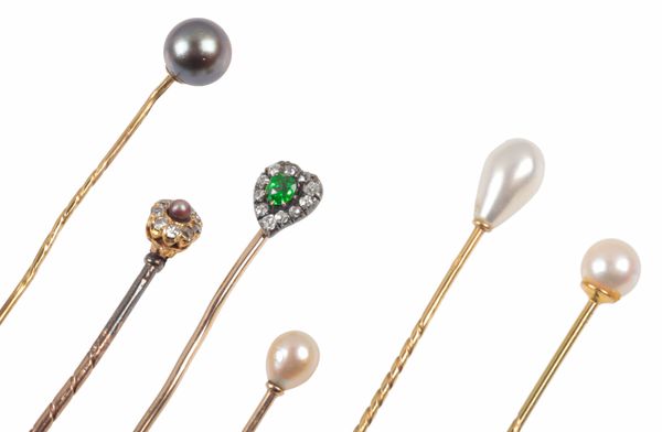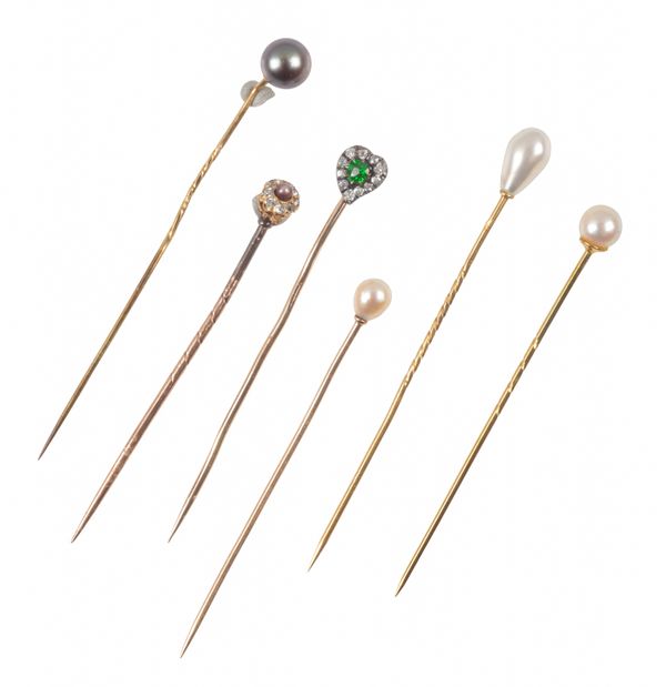 comprising three cultured pearl examples, a black cultured pearl example, a tsavorite garnet and old cut diamond heart shaped example, and a pearl and single cut diamond example, one marked 9ct, one surface testing as 18ct, the remainder testing as 9ct, c. 7.4 grams (6)