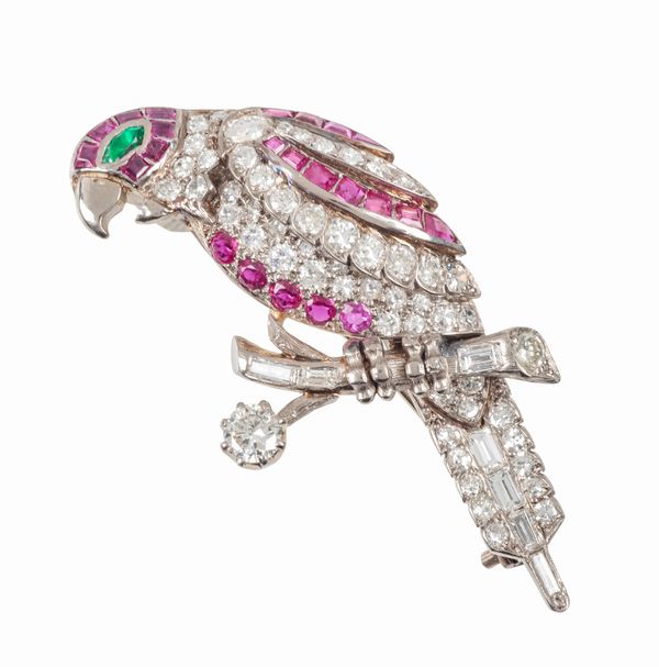 in the form of a parrot perched on a branch, the eye set with a marquise cut emerald, the head and wing set with calibre cut rubies and round brilliant cut diamonds, the body with round mixed cut rubies and round brilliant cut diamonds, the tail with tapering baguette cut diamonds flanked by single cut diamonds, the branch set with three baguette cut diamonds terminating to each end with a brilliant cut diamond, the largest c. 0.25 carats