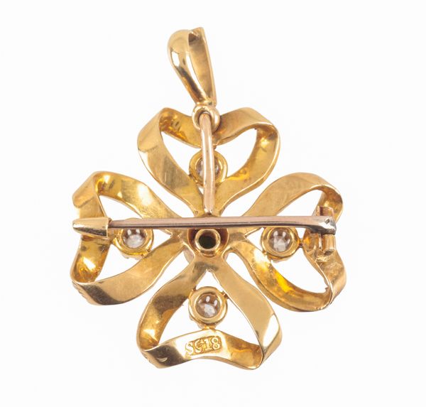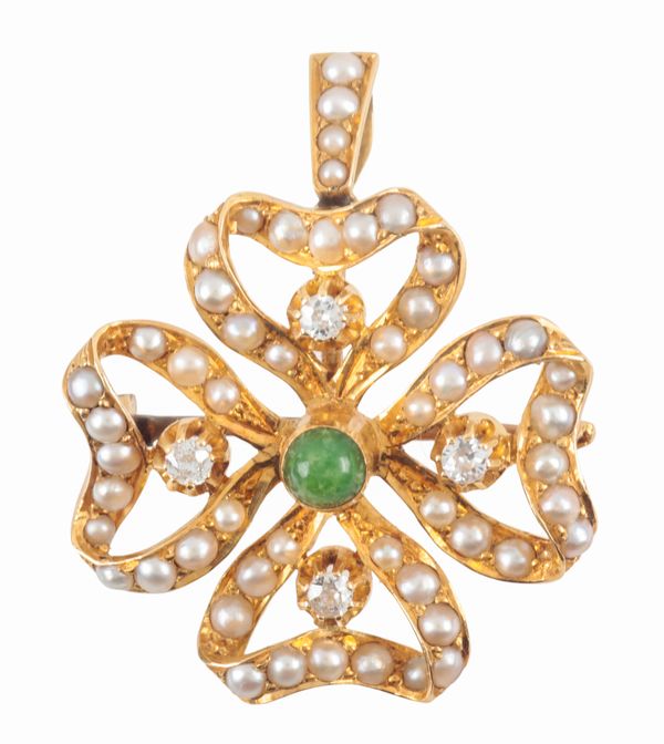 with central round green agate cabochon, four old cut diamonds c. 0.15 carats combined, set with split seed pearls, the setting stamped 18, overall c.30mm x 30mm, with removeable graduated seed pearl bail, c. 9.3 grams gross weight