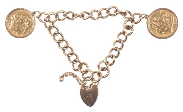 A 9CT GOLD CURB LINK BRACELET WITH TWO MOUNTED FULL SOVEREIGNS