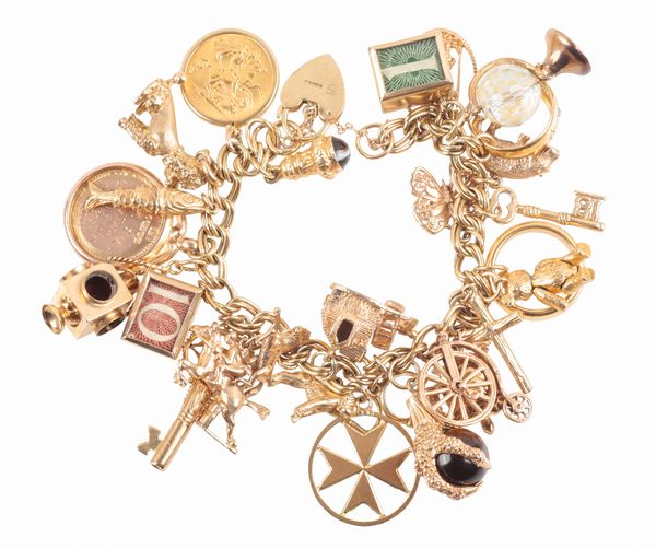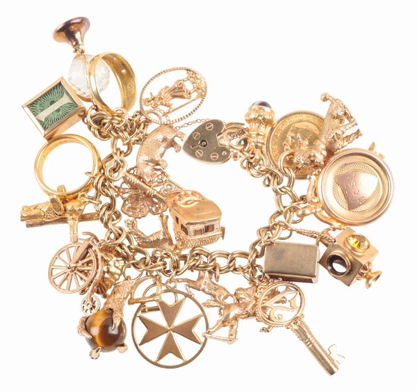 with padlock clasp, twenty seven charms, including a half sovereign dated 1912, a wedding band stamped 22ct, a gypsy style ring stamped 18ct and a Maltese cross stamped c18, c. 103.6 grams
