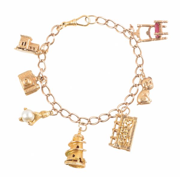 with seven 9ct gold charms attached, c. 29.7 grams total weight
