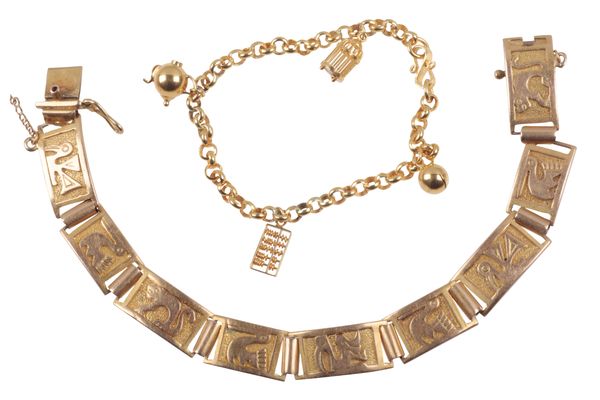 decorated with birds and animals, with tongue and groove clasp, safety clasp and safety chain, stamped 18K; together with a Chinese child’s charm bracelet, with Chinese character mark, surface testing as 14ct, c. 37 grams (2)