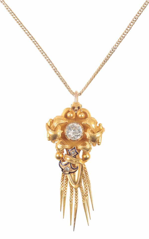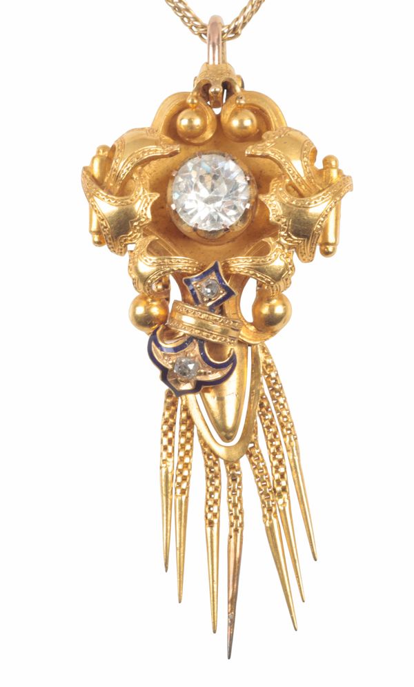 of cartouche form set with central round cut paste, above two diamonds in a hinged mount picked out in blue enamel, above tapering hinged tassels, unmarked surface testing as 18ct, length c. 52mm, c. 7.6 grams, on an associated gilt curb link chain