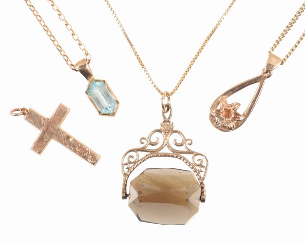 comprising a daffodil pendant, a swivel seal pendant, and an aquamarine set pendant, all hallmarked bar the swivel seal, each on hallmarked chains; together with a cross stamped 9ct, c. 17.6 grams gross weight (4)