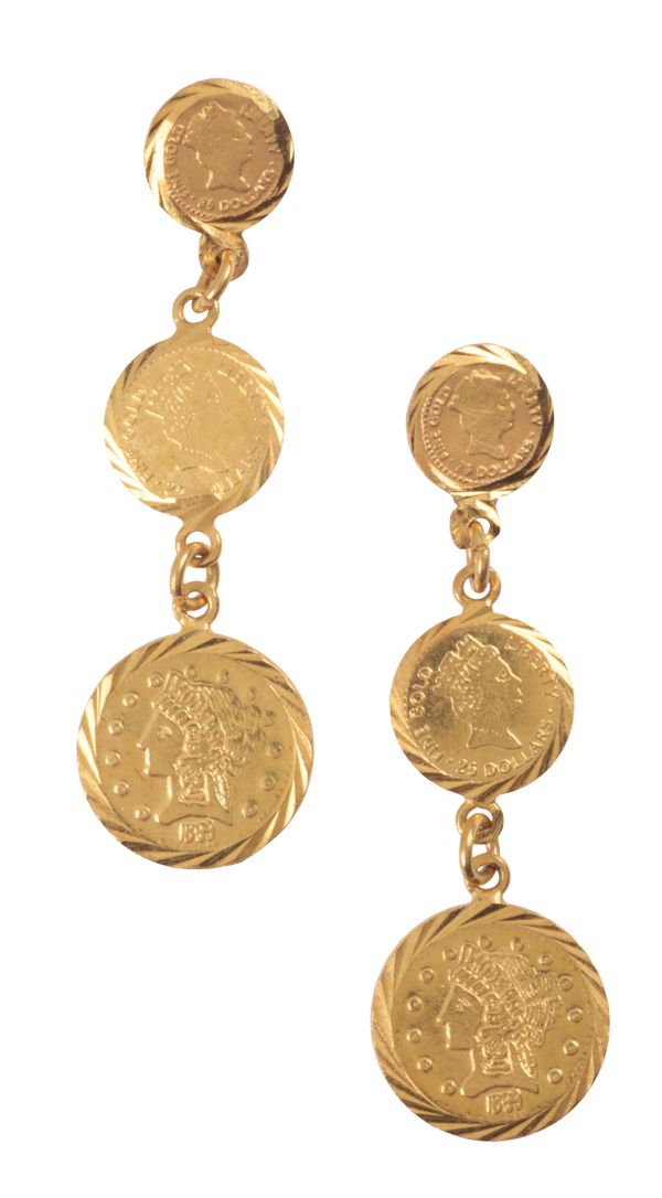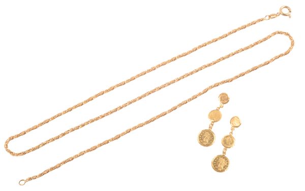 the twisted chain necklace, stamped 21K; together with a pair of graduated "dollar" coin drop ear studs, unmarked testing as high ct, c. 14.7 grams (2)