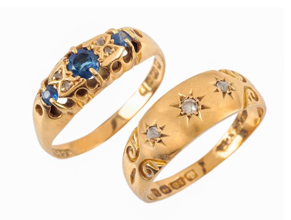 the shank hallmarked 18ct, ring size N; together with a sapphire ring, hallmarked 18ct, ring size O, c. 5.6 grams total weight (2)