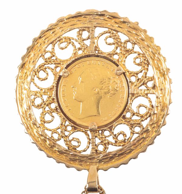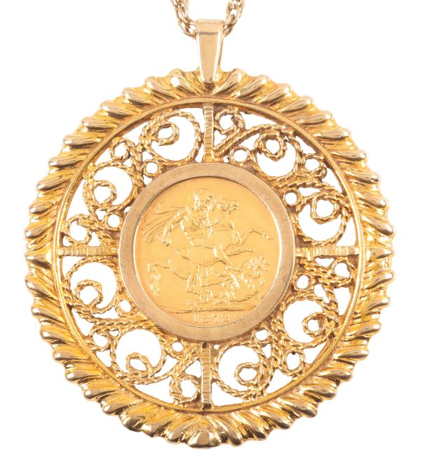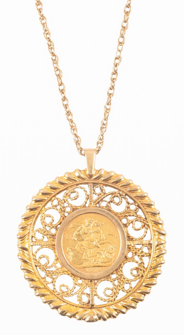the sovereign dated 1872, mounted in a 9ct gold open work mount, attached to an unmarked yellow metal chain, 76cm long, c. 33.6 grams total weight