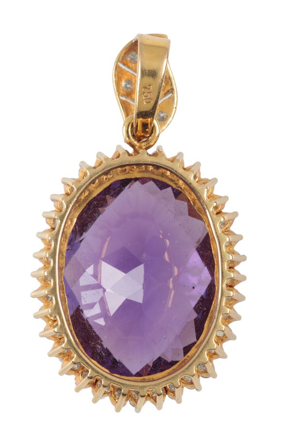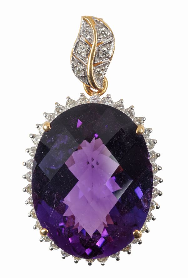 the oval briolette cut amethyst c. 23mm x 18.1mm with round brilliant cut surround and leaf shaped bail, stamped 750, c. 10.8 grams