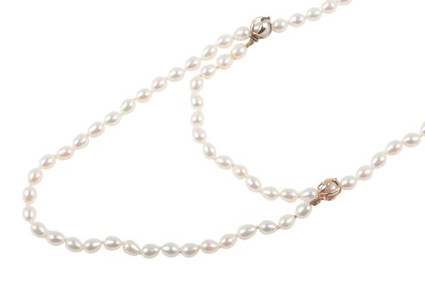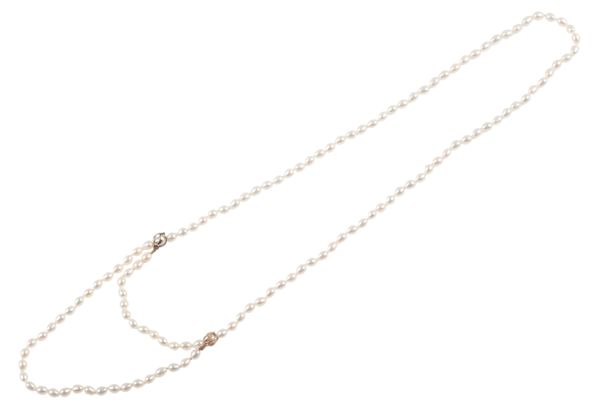 the long string of baroque pearls with two hinged ball clasps allowing length adjustment, unmarked, surface testing as 9ct, overall c. 92cm long