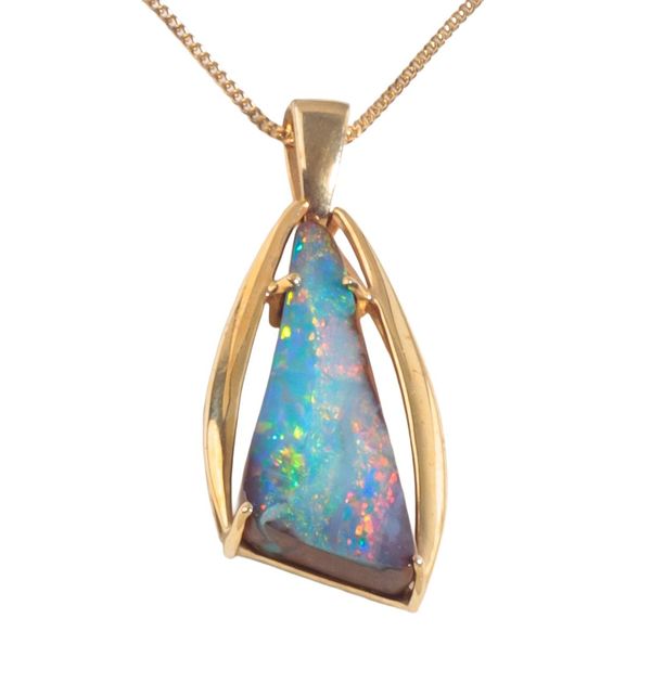 in 14ct gold, set with a boulder opal of c. 12mm x 28mm x 4mm, held in a stylised mount, suspended from a Cuban link chain, secured with a bolt ring clasp, stamped '14K' '585', pendant c. 2.8cm, chain c. 16-18in, c. 6.3 grams