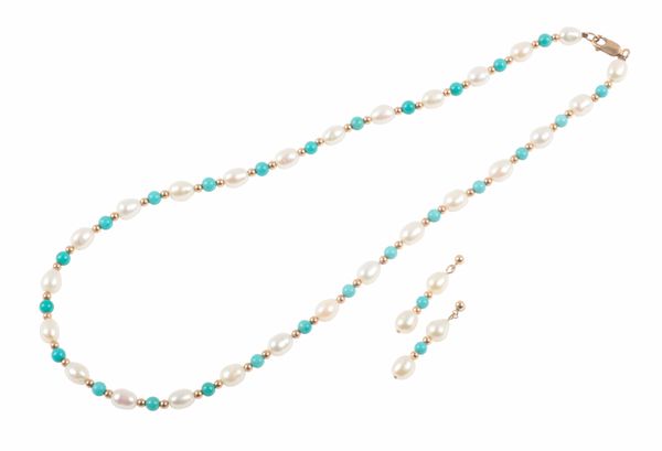 the irregular oval pearls strung with 9ct and turquoise beads with a lobster clasp stamped 9K, c. 410mm long; together with matching earrings c. 25 mm drop, stamped 9ct (2)