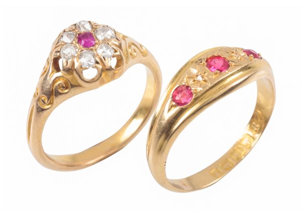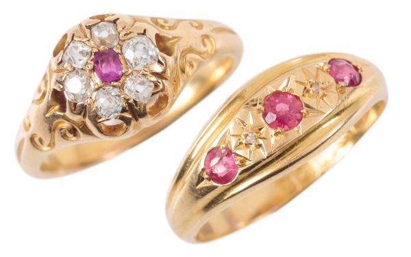 set in hallmarked 18ct yellow gold, ring size O; together with a ruby and diamond cluster ring set with old cut diamonds, unmarked, surface testing 14ct, ring size M, c. 6.7 grams, in one ring box (2)