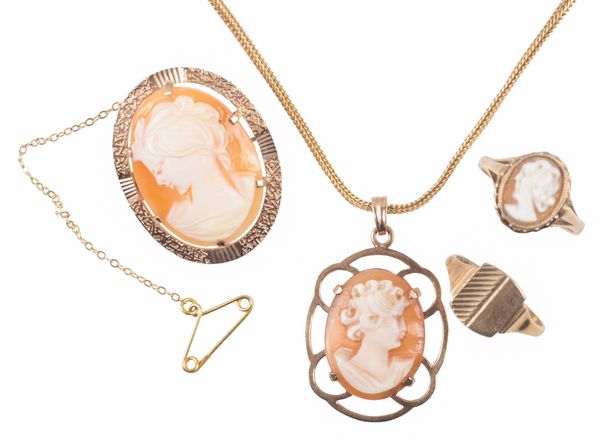 the brooch, cameo ring, signet ring, and pendant all hallmarked 9ct yellow gold, the chain marked 9ct to the clasp, c. 19 grams gross weight (4)