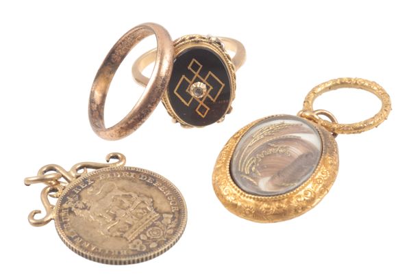 comprising a George IV 1826 shilling, gilded and mounted as a fob, a mourning ring set with a mine cut diamond and hair glazed reverse to the ring head, shank stamped 9ct, ring size J, a gilded wedding band, and an early Victorian locket with cross on and engraved foliate ground and hair glazed panel to the reverse on a foliate split ring, surface testing as 14ct (4)