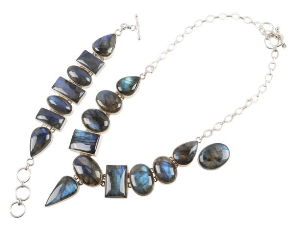 comprising an oval cabochon ring, size P, stamped 925, a bracelet set with pear, rectangular and oval cabochons with adjustable T-bar and ring fastening, stamped 925, and a similarly arranged necklace with pear shaped drop with adjustable T-bar and ring fastening, stamped 925, c. 178 grams gross (3)