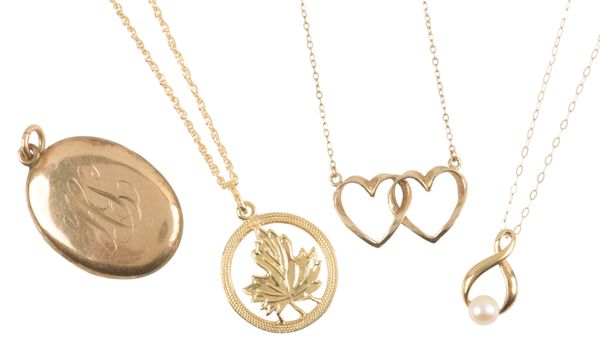 pendant drop c. 30mm, c. 6.1 grams; together with two 9ct gold pendant necklaces, c .3.5 grams; and an unmarked yellow metal hinged locket (4)