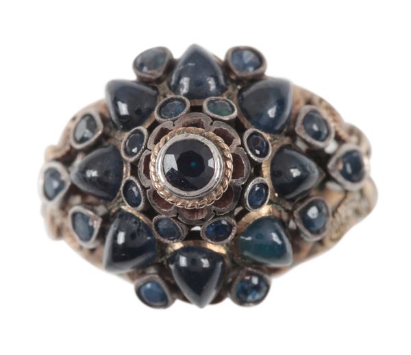 set with round mixed cut and pear shaped cabochons in yellow metal stamped 14K, ring size P 1/2, c. 6.0 grams