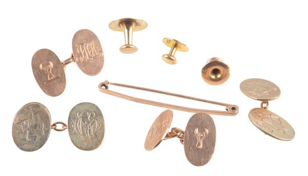 to include two pairs of 9ct gold cufflinks, c. 15.9 grams, a 9ct gold tie pin, c. 1.5 grams, two 15ct gold studs, c. 2.1 grams, and one 18ct gold stud, c. 1.1 grams (6)