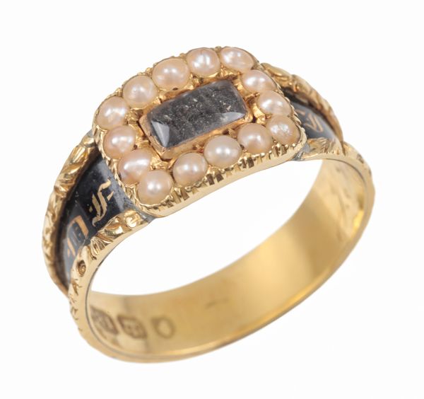 set with a hairwork panel with seed pearl surround, the black enamel band with motto between chased foliate borders, the inner shank engraved "J. Streather Obt 26th Nov 1836 at 55", hallmarked London1834, ring size R, c. 3.8 grams, (boxed)