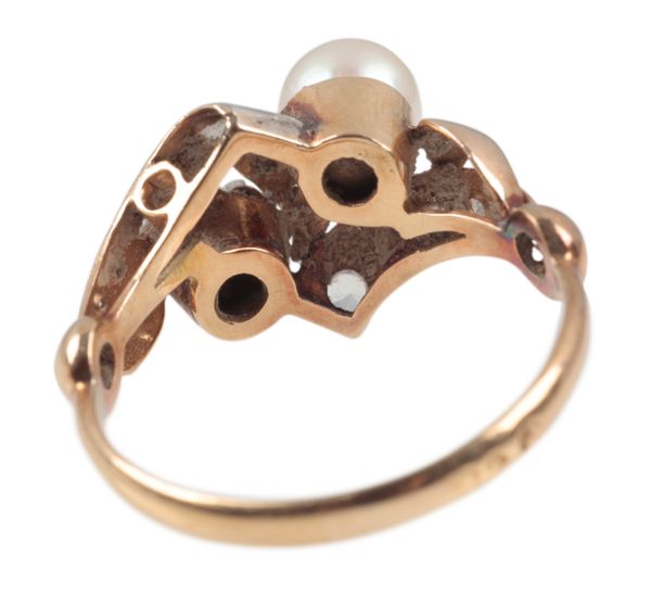 of asymmetrical design, the cultured pearl c. 5.7mm, unmarked, surface testing as 18ct, ring size N, c. 3.3 grams