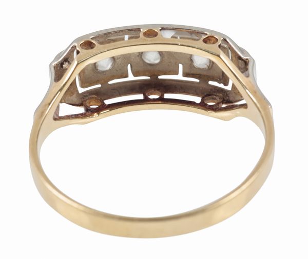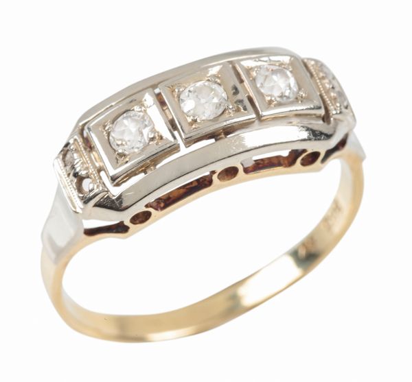 the old cut diamonds set in square mounts with rose cut diamonds to the shoulders (one stone deficient), the shank stamped 585, ring size Q 1/2, c. 2.5 grams