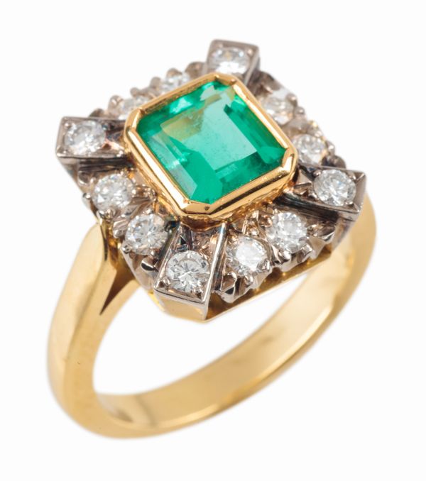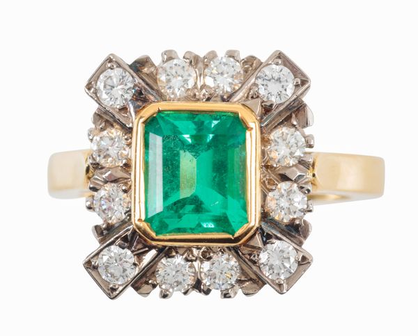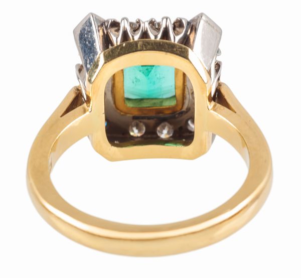 the rectangular emerald collet-set within a border of twelve old mine-cut diamonds, on an 18ct gold shank with openwork shoulders, ring size Q/R, c. 11.0 grams total weight