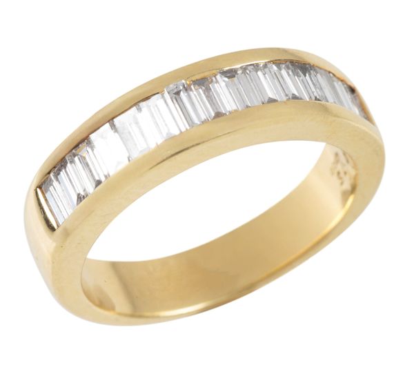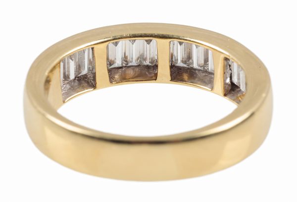 the baguette cut diamonds, 0.76 carats, set in hallmarked 18 carat yellow gold, ring size L, c. 5.5 grams